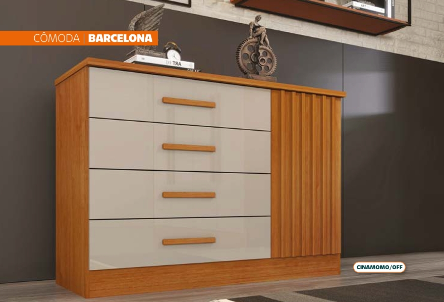 Cômoda Barcelona. Produto em MDF e MDP, tampo em MDF 25mm, corrediças telescópicas, kit pés opcional (vendido separadamente).