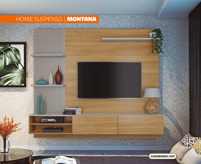 Home Suspenso Montana. TV até 60", painel em MDF com detalhe frisado, duas portas básculas com pistão a gás, acompanha suporte para TV.