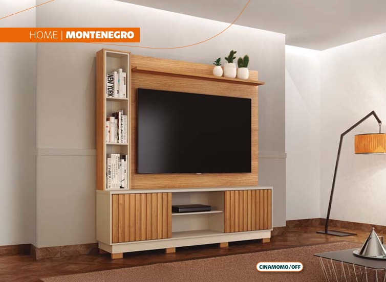 Home Montenegro. TV até 65", portas ripadas deslizantes em trilho de alumínio, nicho vertical na lateral, acompanha suporte para TV.