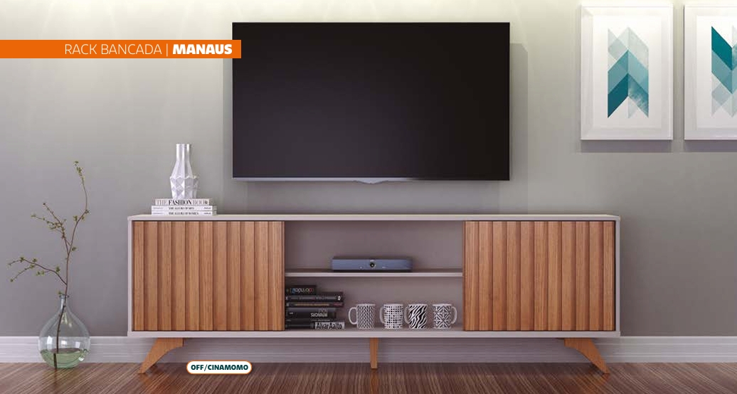 Rack Bancada Manaus. TV até 65", portas deslizantes em trilho de alumínio, acompanha pés de madeira.