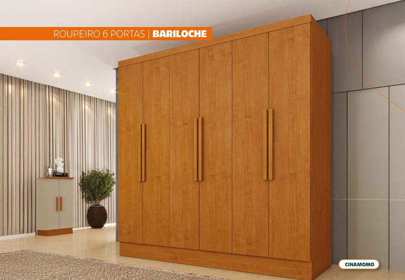 Roupeiro Bariloche 6 portas. Produto em MDF e MDP, puxadores em MDF, cabideiros em alumínio, corrediças telescópicas, kits pé e espelho opcionais (vendidos separadamente).