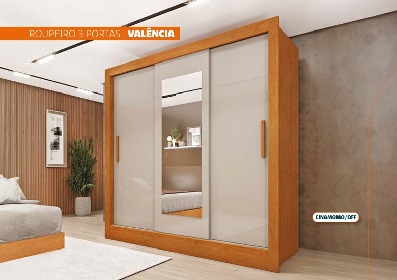 Roupeiro Valência 3 portas. Produto em MDF e MDP, puxadores em MDF, cabideiros em alumínio, corrediças telescópicas, trilho inferior em alumínio, kits pé e espelho opcionais (vendidos separadamente).